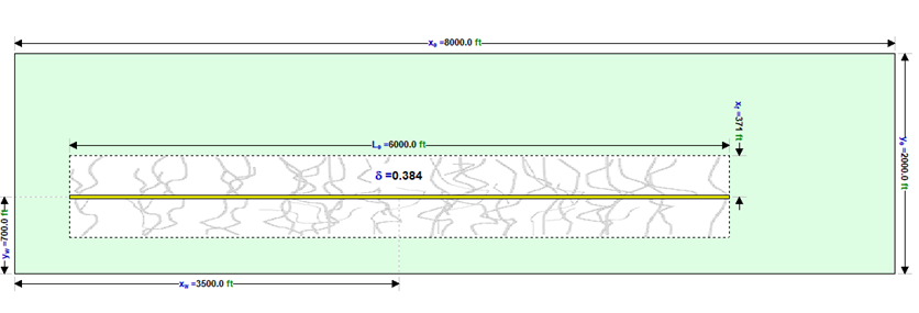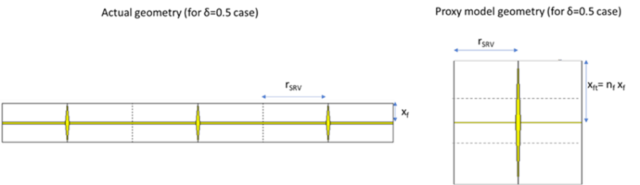For the case with equally distributed fractures (δ=0.5), Equation 28 simplifies to rSRV=0.5ASRV/(2xf)=Le/(2nf). In this particular case the geometry of the proxy model is just a rectangle that represents fractures stacked on top of each other: