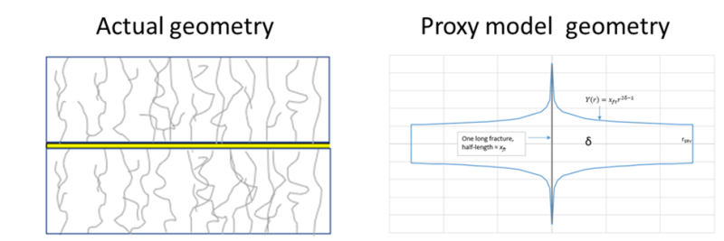 With the FD-RTA approach, we do not make assumptions about the actual geometry of the fracture network. Instead, we come up with analogous geometry, that gives the desired pressure response (a solution that follows the desired series of slopes on a log-log plot). The resultant solution can then be used for history matching and forecasting (even though it isn’t based on the actual geometry).
