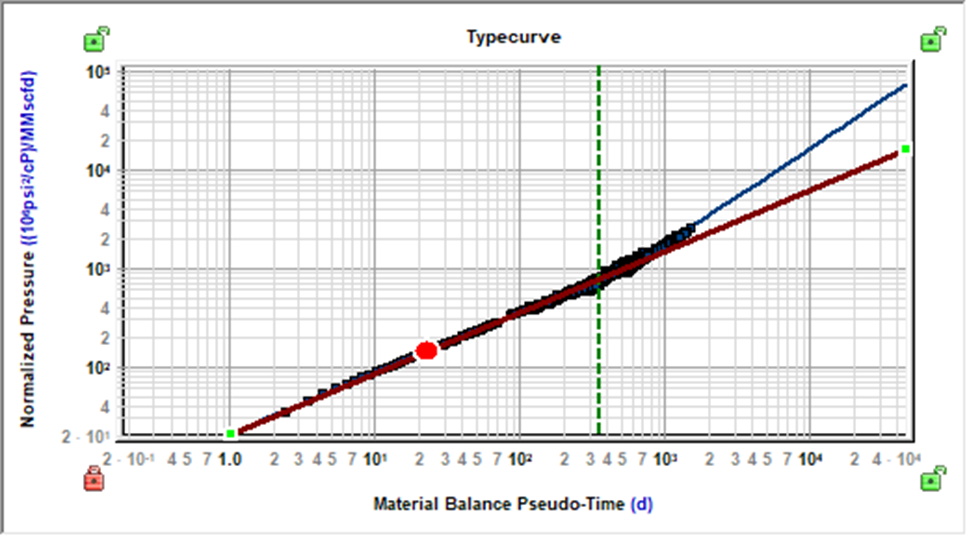 We plot normalized pressure vs. (tc)1-δ on this plot. As per Equation 24, the early data is expected to follow a straight line with a slope of m and intersect of ∆Ps on this plot. The interactive line on this plot is moved to account for ∆Ps.
