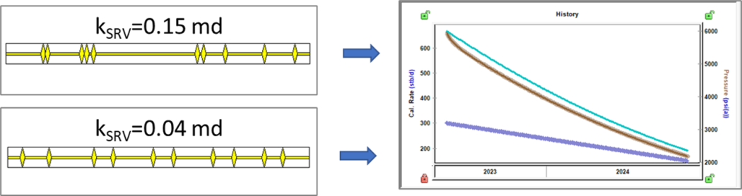 The solution for the diffusivity equation described earlier assumes the same permeability across all regions of the model. However, a modification can be made to account for the cases where kmatrix < kSRV.