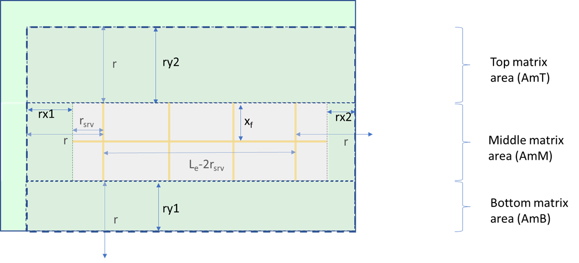 When the distance between fractures is high as compared to xf (Figure 13), part of the matrix will be investigated while the well is still experiencing characteristic flow. In this case it is not possible to accurately describe investigated area as a function of just one variable r. The issue is partially mitigated by incorporating the δ correction; but even with this correction we may end up getting δi > 1. In this case further calculation is impossible.