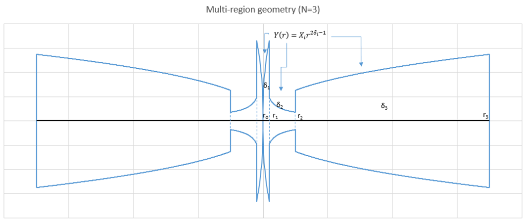 One way to understand the way the proxy model is constructed, is to first think of a special case where there is just one region with δ=0.5 (equally distributed fracturs). In this case Y(r)=X1r2δ-1=xft. Therefore, for this case the geometry of the proxy model reduces to a rectangle that represents fractures stacked on top of each other: