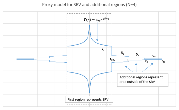 Typically, the distance between fractures is considerably smaller than xf. Consequently, the transient reaches the boundaries of the SRV first, and then the contribution from the matrix becomes significant. A proxy model that has first region representing SRV followed by regions representing matrix is accurate for this case. However, if you set a small nf, the contribution from beyond the SRV will start making effect before the transient reaches the end of the SRV. In this case: