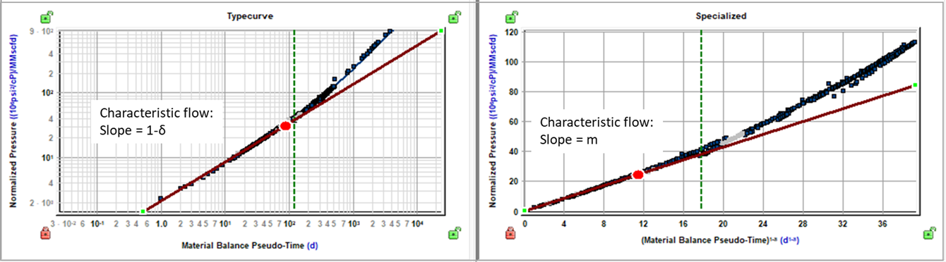 Since δcorrected is used for the first region, the slope of the typecurve during the characteristic flow period is (1- δcorrected).