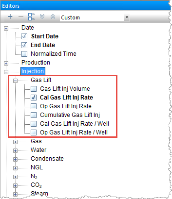 - Under the Production node, click Gas. This is gas produced from the reservoir. If you have gas lift operations, this is a “net produced gas”; which is gas produced from the well minus the gas injected for gas lift.