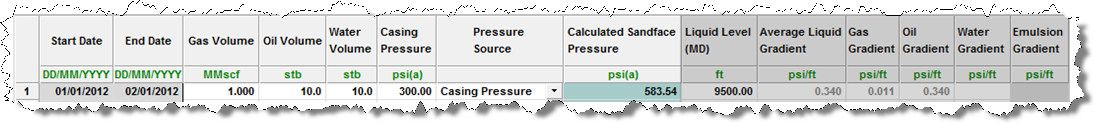 The first shut-in row sets the height of the static oil column. If the liquid level rises, the oil column also rises, followed by an emulsion. The WOR of the last producing row is used to calculate the emulsion gradient for all of the following shut-in rows in this period until the well begins to flow again.