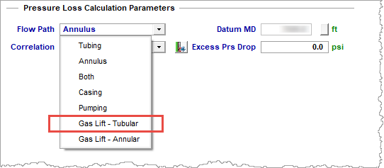 Open the Wellbore editor. Click the Flow Path drop-down menu in the Pressure Loss Calculation Parameters section, and select Gas Lift - Tubular.