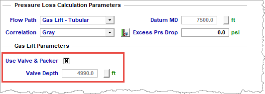 To model your gas lift system conventionally, click the Use Valve & Packer box. You must also specify the depth of the operating valve. If you do not specify a depth, Harmony Enterprise uses a default valve location 10 feet above EOT. With a packer in place, you must use tubing pressure as your pressure source. Sandface pressures cannot be calculated using the casing side pressure source.