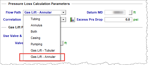 Open the Wellbore editor. Click the Flow Path drop-down menu in the Pressure Loss Calculation Parameters section, and select Gas Lift - Annular.