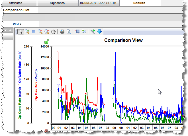 The Plot View displays the axis parameters you select from the tree structure in a plot; you can plot attribute and result values, and a cross plot is used to analyze relationships between input and output parameters. If you are only plotting attribute values, you do not need to perform an analysis. For a description of plot options, see plot components.