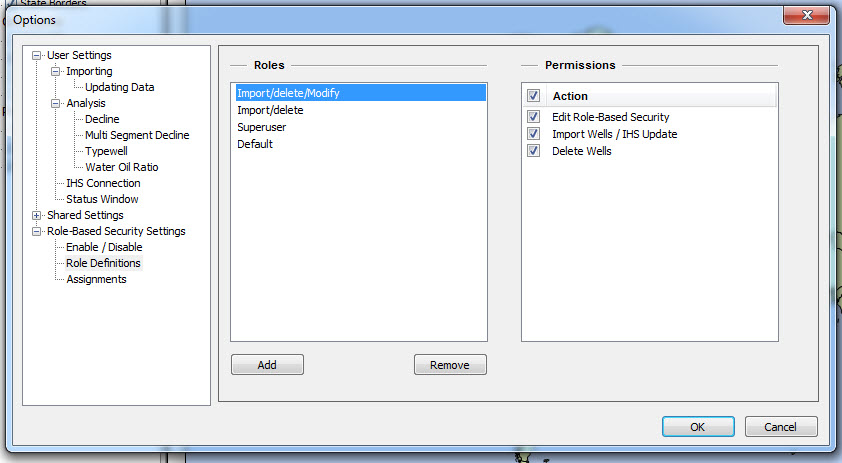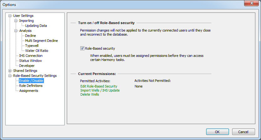 Role-based security is set in the Options dialog box, under the Role-based Security Settings node. To determine your permissions for your current session, click the Enable / Disable node. Any activities that are not allowed are displayed in red text under the Activities Not Permitted heading.