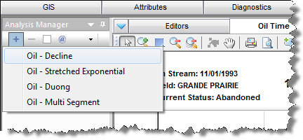 3. Add an analysis by clicking the + icon on the Analysis Manager toolbar and selecting an analysis type. A decline analysis is shown as an example.