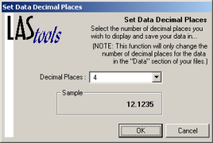 Set Data Decimal Places - Click to display the Set Data Decimal Places dialog box as depicted below and type the number of decimal places to use when displaying and saving data in the ~A ASCII Log Data section of the LAS file. This decimal setting only affects curve data, not other numeric data in the LAS file.![]()