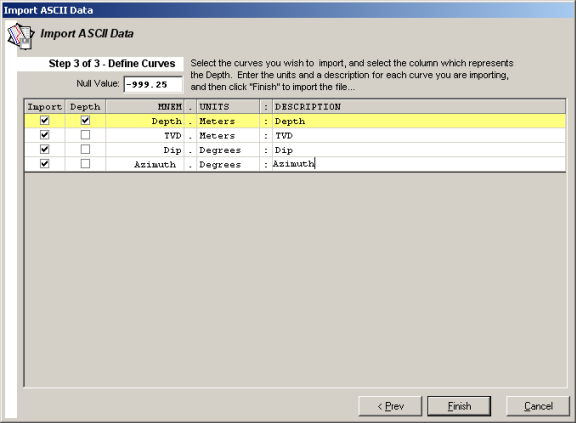 - Select the columns to import and also the column from which to import depth measurements, and then click Finish.