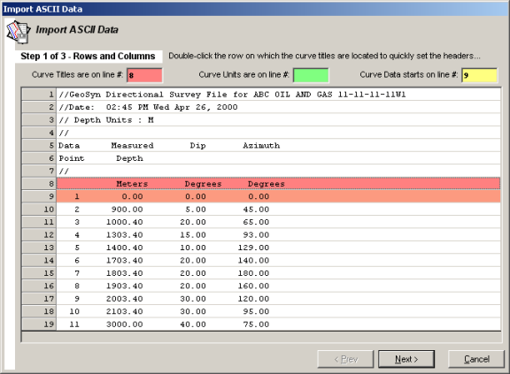 The Import ASCII Data dialog box appears. This dialog box enables you to define the columns and lines of importance.