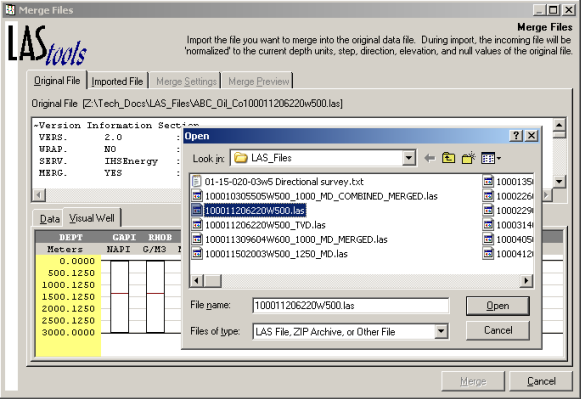 If you want to review the existing LAS file before selecting a file to merge, using the Open dialog box, click Cancel and then review the Original File: Data and Original File: Visual Well tabs. To resume importing the merge file, using the Merge Files dialog box, click the Imported File tab and click Open in the top-left of the dialog box.