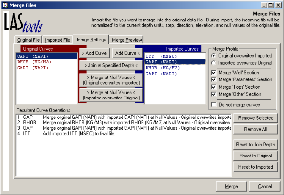 Merge the curves in the current LAS file with the curves in another LAS file. LAS tools provides a merge instruction pane called Resultant Curve Operations where impending merge operations are listed for your review. Delete instructions in this pane to prevent an action from occurring.