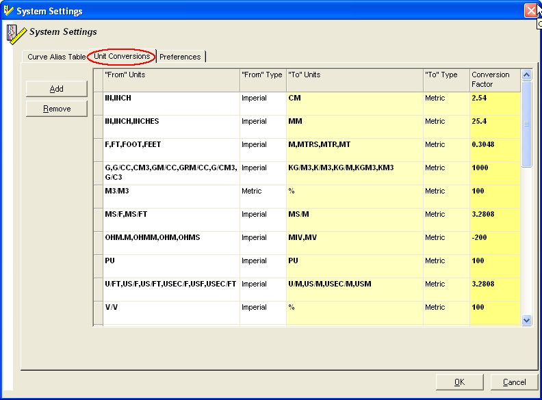 Auto-Insert of Conversion Factors – occasionally, a new curve loaded into Visual Log has a unit type that is not recognized in the Units Conversion table. When this occurs, Visual Log automatically inserts a record in the Units Conversion table, display the table, and prompts you to enter the appropriate factor.