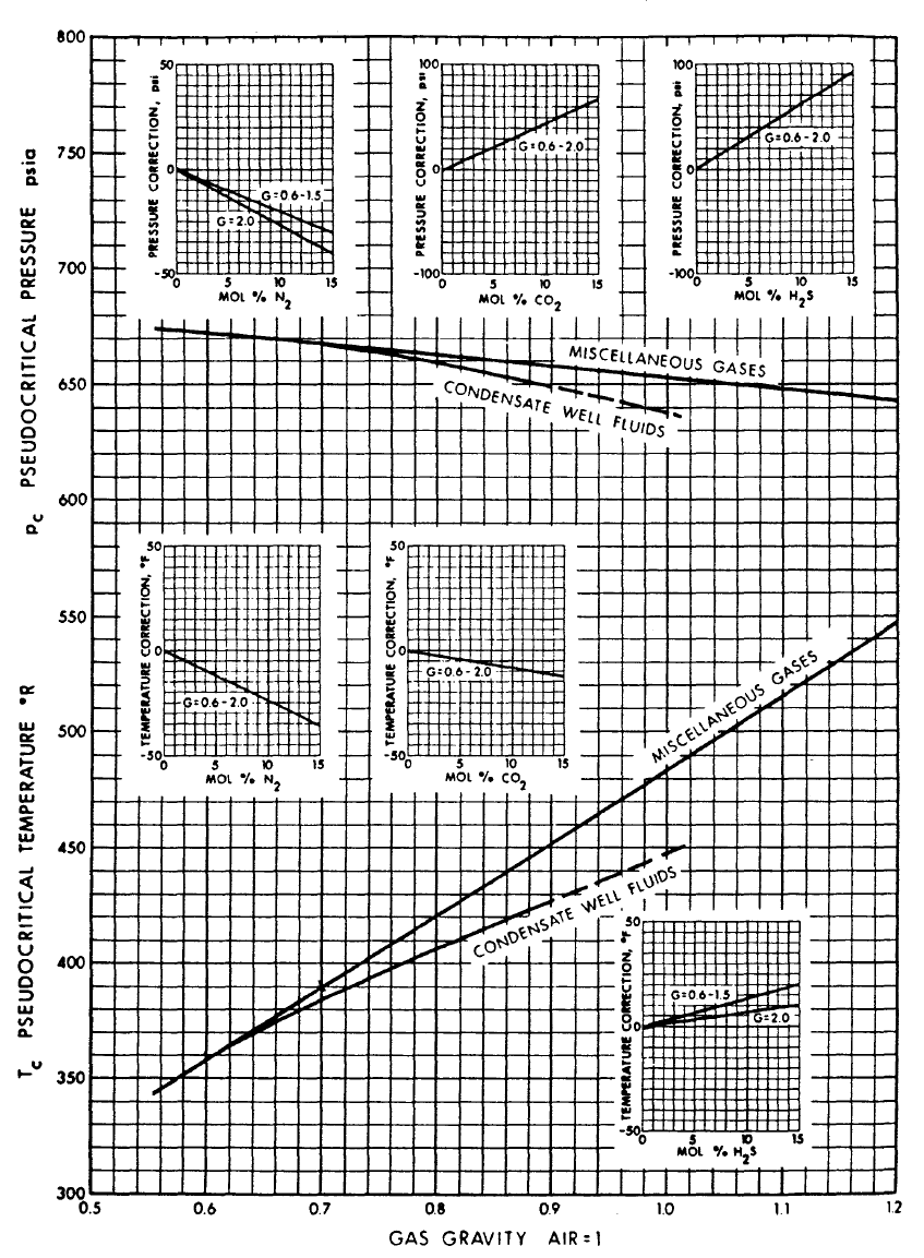 The upper curve for each is used for dry gas and the lower curve for wet gas. Corrections for non-hydrocarbon components are also provided as insets in the plot.