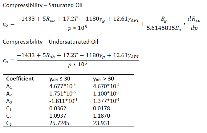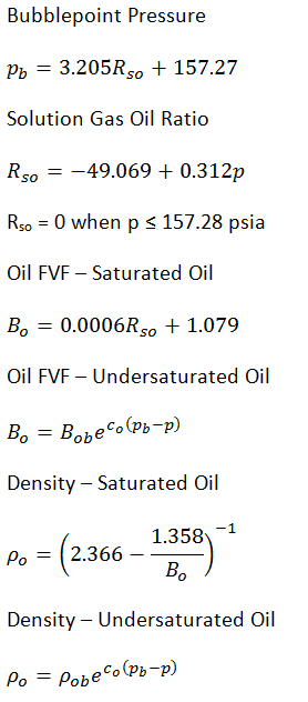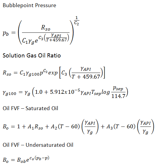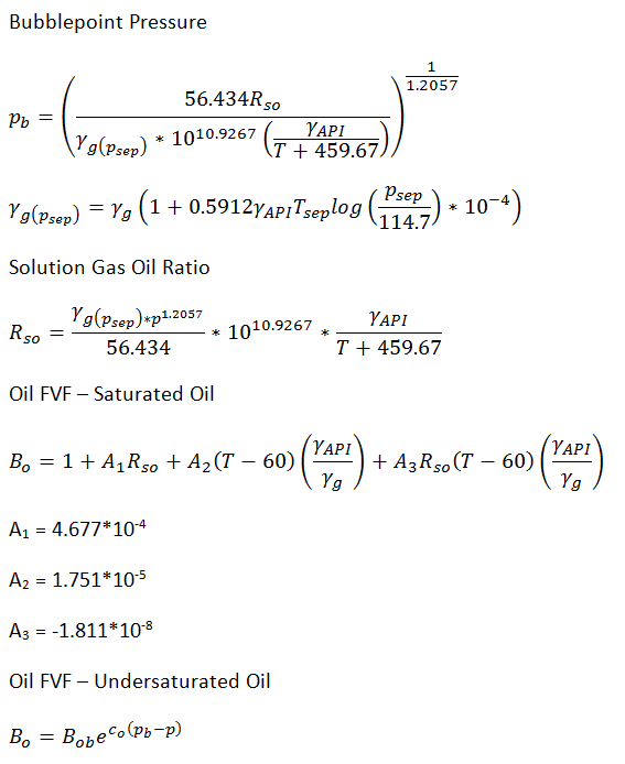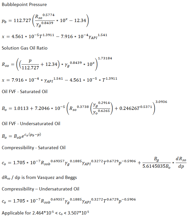 Applicable for oil gravity of 16° < API < 45°. For Gulf of Mexico oils, it has been found to provide improved results over Standing, Vasquez and Beggs, and Glaso.