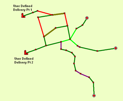 In systems where the user has defined more than one delivery, Piper defines a “primary” or “hidden” delivery point. This Primary Delivery Point is an internal point, visible to the software only. All user defined delivery points are linked to this internal point. The following images illustrate the difference between what Piper displays on-screen (to the user) and what the software “sees” internally.