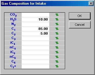 The input required for each of the recovered hydrocarbons depends upon whether a simple or detailed gas composition is being used. If a simple gas composition is specified, then the input requires the amount of each hydrocarbon stream to be specified on the basis of a Liquid to Gas ratio. If a detailed gas composition is specified, each hydrocarbon stream is specified on a volumetric percentage basis of the total volume of that hydrocarbon. This is referred to as the recovery efficiency.