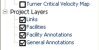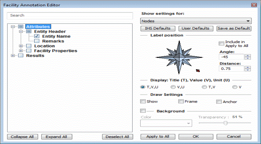 Each facility type has various information that can be displayed. The left-side of the Facility Annotations Editor, contains a list of properties specialized for the facility type that can be displayed in the map. The right-side has visual properties for the annotations. By default, all annotations are turned off making it easier to create and modify models. Custom defaults can be saved if you prefer by clicking the Save as Default button.