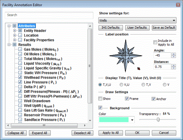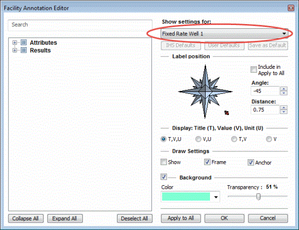 The Apply to All button will apply the current settings to all facilities of the same group. For example, annotation settings for Well 1 will be applied to all well type facilities. Apply to All will also overwrite all custom annotations and reset all annotation positions.