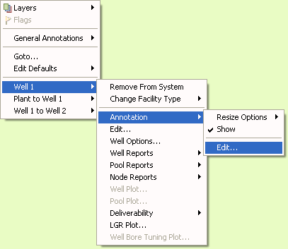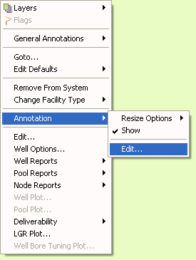 Customized annotations can be set for each facility, if specialized annotations are required. To modify the display options of any facility on the gathering system map, place the cursor over the facility and right-click. You are prompted with one of the following drop menus: