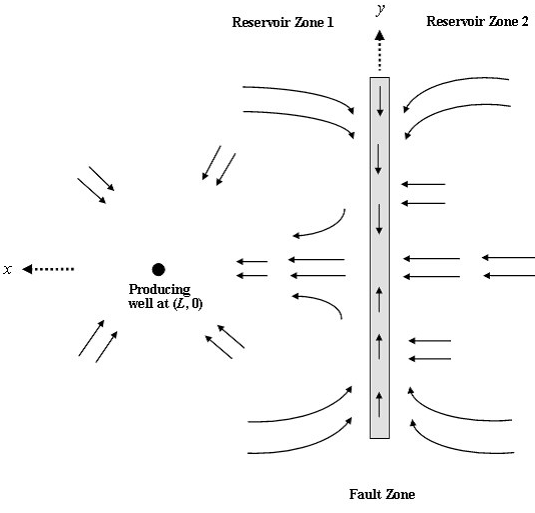 The model accounts for transient flow within the fault as well. The formulation considers a line sink well located in a two-zone reservoir, separated by a finite-conductivity fault. The width of the fault is neglected for simplicity when developing the solution, except in the definition of the fault conductivity. The fault is characterized by two parameters: