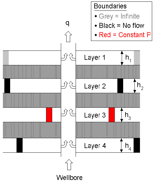 Each layer is considered to have a rectangular geometry with an identical initial pressure (pi) to other layers, as well as its own skin factor, reservoir properties, and outer boundary conditions. This well may be at any location within each layer and the model supports infinite, no-flow, and constant pressure boundaries. Thus, classical configurations like a well near a sealing fault, or a constant pressure boundary near intersecting faults can be easily modeled.