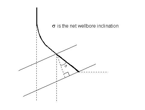 Many wells are drilled inclined to the vertical plane, or drilled vertically into a formation that is dipping as shown in the diagram below. The angle between the wellbore and the perpendicular line to the formation is defined as the net wellbore inclination measured in degrees.