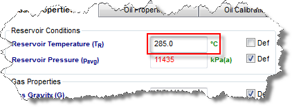 7. Click the Properties tab. Depending on the type of reservoir fluid specified earlier, click either the Gas Properties, Oil Properties, or Water Propertiessub-tabs. Change the Reservoir Temperature value and enter the fluid properties.