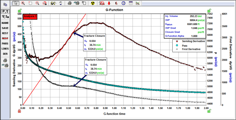 Pre-closure analysis consists of identifying closure and analyzing the early pressure falloff period while the induced fracture is closing. One of the most critical parameters in fracture treatment design is the closure pressure. One specialized analysis technique used to identify closure is, in pressure transient parlance, the G-Function Analysis.