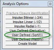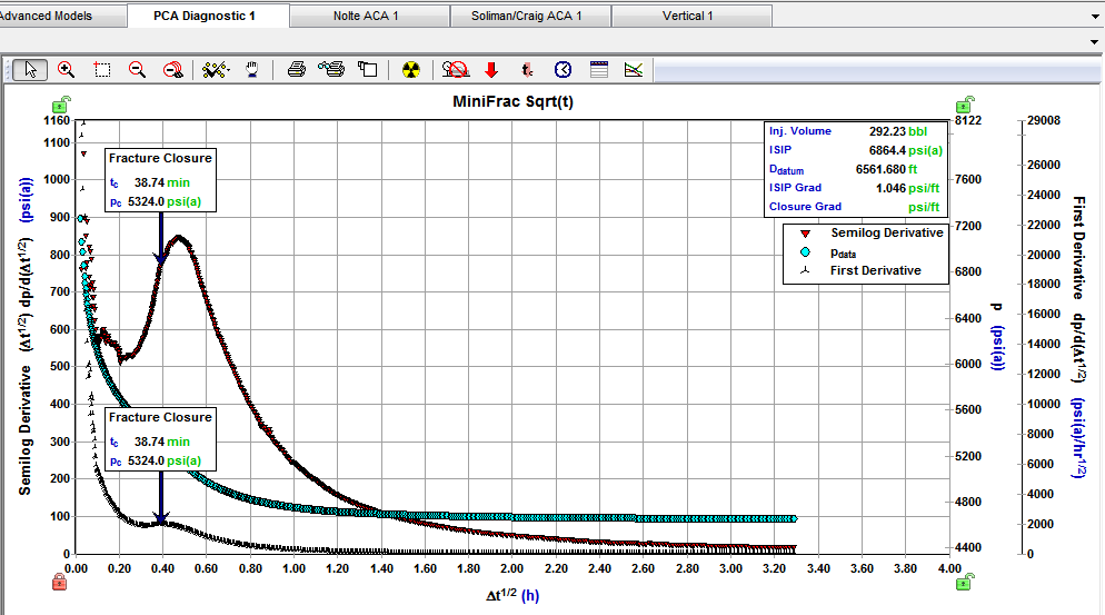 Fracture closure can be identified by the peak of the first derivative on the MiniFrac sqrt(t) plot, which corresponds to an inflection point on the pressure curve. The semi-log derivative behaves similar to the semi-log derivative on the G-Function Analysis. A user-defined (Sqrt(t)) analysis line may be added to the MiniFrac Sqrt(t) plot to help identify the point of inflection.