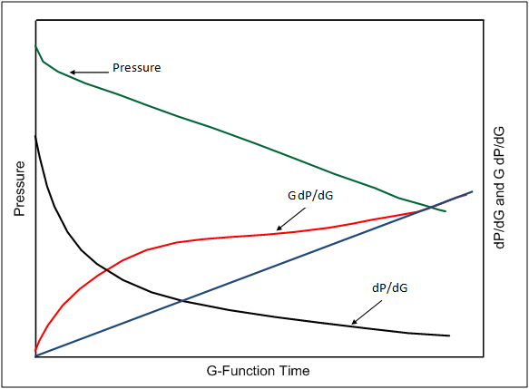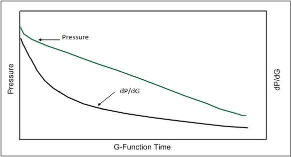 - The G-Function semi-log derivative G dP/dG initially exhibits a large positive slope that continues to decrease with shut-in time, yielding a concave-down curvature.
