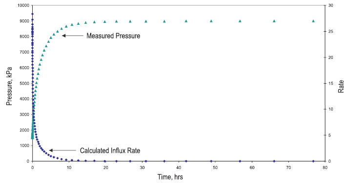 In gas wells, the pressure is usually measured at the wellhead and converted to sandface. This conversion is primarily due to hydrostatic head because the influx rate into the wellbore diminishes rapidly (and friction is negligible). The influx flow rate is not measured but can be estimated using closed chamber calculations, provided the assumption of single-phase flow can be justified. The figure below shows the typical profiles of measured pressure and the calculated gas influx rate for a perforation test of a gas well. As shown here, the influx rate declines rapidly.
