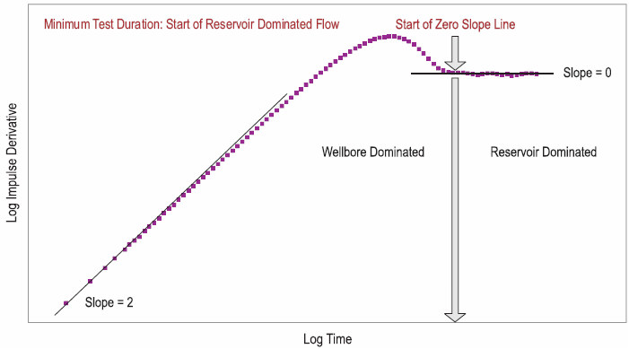 A typical derivative using the above equation is shown in Figure 2. It illustrates that the early time data (wellbore storage) has a slope of 2 for a positive skin (well test derivative has a slope of 1), and the late time data (reservoir flow) has a slope of 0 (flat line, same as the conventional well test derivative).