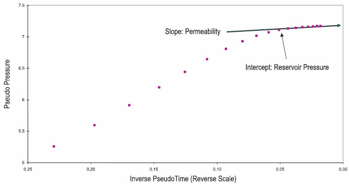 6. Analyze the late time data by plotting pseudo-pressure (y) versus inverse pseudo-time (1 / Dta) on reverse Cartesian coordinates (see Figure 3). A straight line through the valid late time data gives permeability (k) (from slope (m)) and initial reservoir pseudo-pressure (yi) (from intercept) using the following equation: