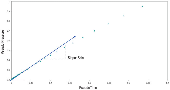 Experience shows that it can be difficult to differentiate between a small positive skin (s') and a zero or negative skin (s'), based on the early time analysis alone. Under such circumstances, the PITA model provides a more reliable indication of the skin (s') value, if reservoir dominated flow is achieved, or at least, if a transition to reservoir dominated flow is developed.