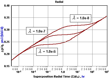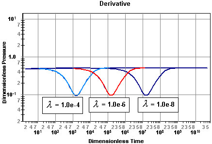As shown in the plot below, as the interporosity flow coefficient decreases, the transition between the two semi-log straight lines is delayed. That is, the larger the fracture permeability is in comparison to that of the matrix, the more time the fractures will have to drain before the contribution from the matrix becomes significant.