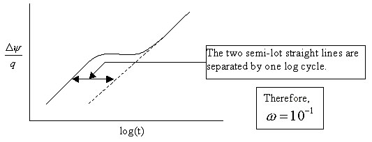 The second parameter, storativity ratio (w), essentially represents the time separation in log cycles between the two semi-log straight lines as shown below: