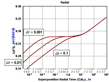 A storativity ratio of 1 is a single porosity system with all of the reserves inside the fractures, and a storativity ratio approaching 0 is a single porosity reservoir with all the reserves inside the matrix. Therefore, as the storativity ratio is decreased, a greater portion of the reserves are contained in the matrix, and the longer it takes for the matrix and fracture system to reach a state of equilibrium. This is shown in the following plot: