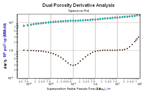 The signature of dual porosity on a derivative plot shows up as two regions of radial flow with the same conductivity, kh, separated by a transition period. This is often referred to as the dual porosity dip.