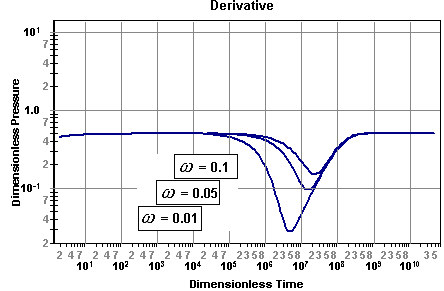 As in the case for the semi-log plot, the shape and location of this transition period (or dual porosity signature) is defined by the interporosity flow coefficient (l) and the storativity ratio (w) as shown in the plots below.
