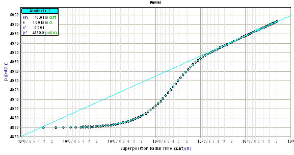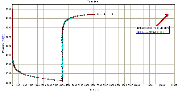Extrapolated pressure is the predicted pressure that a buildup will stabilize back to at infinite shut-in time. For a semi-log or radial analysis (shown in the plot below), it is obtained from the intersection of the semi-log straight line at infinite shut-in time, which is the limit of 1 hr for Horner or superposition radial time.