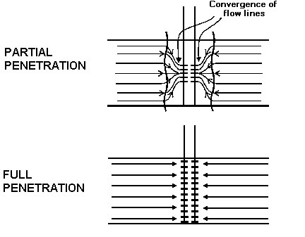 When a well does not fully penetrate the formation, or the perforations do not open up the whole formation, the reservoir fluid has to flow vertically with the flow lines converging near the penetrated area at the wellbore. The diagram below shows the flow pattern differences between full and partial penetration.