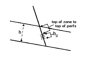 Normally, in order to maximize production, the entire net pay (h) is open to flow into the wellbore (fully penetrated, hp = h). In some cases, it is necessary to perforate so only a portion of the net pay (h) is open to the wellbore in order to minimize coning effects. This perforated interval is judiciously placed a certain distance from the top of the zone to the top of the perforations (htop). If the wellbore is inclined, the perforated interval is measured along the inclination as illustrated below.