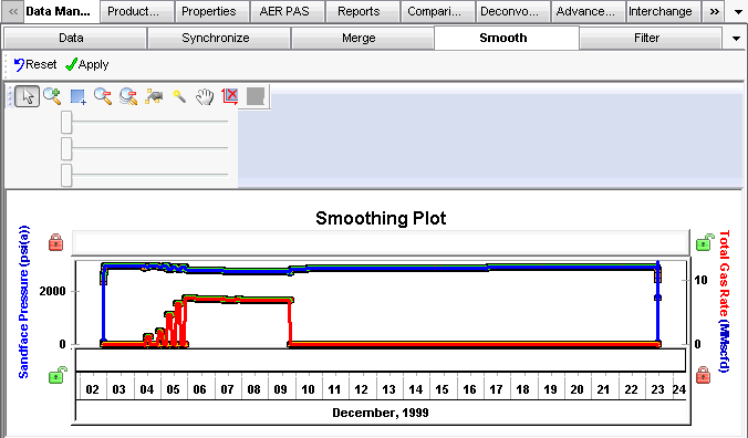 Datasets contained within a gauge can be smoothed by clicking the Smooth sub-tab. This tab contains a plot displaying the data points and a smoothed line for each curve. It also has three sliders: the middle one smooths the active curve, and the left and right ones control the degree of smoothing on the left and right edges of the selected period.
