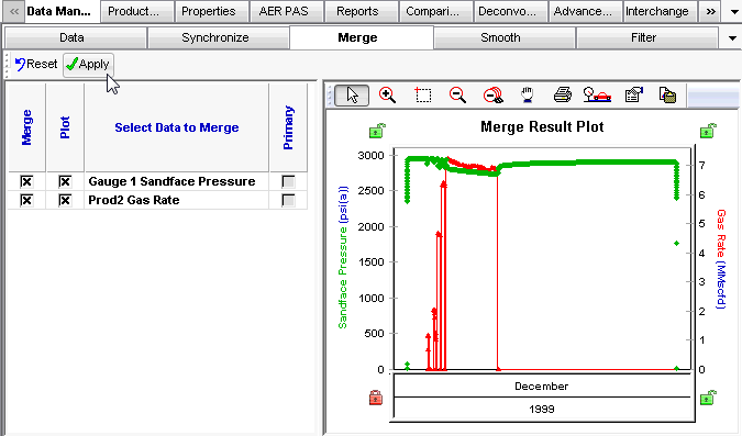 In the Merge tab, you can select the datasets to be merged and view the result of the merge on the plot.